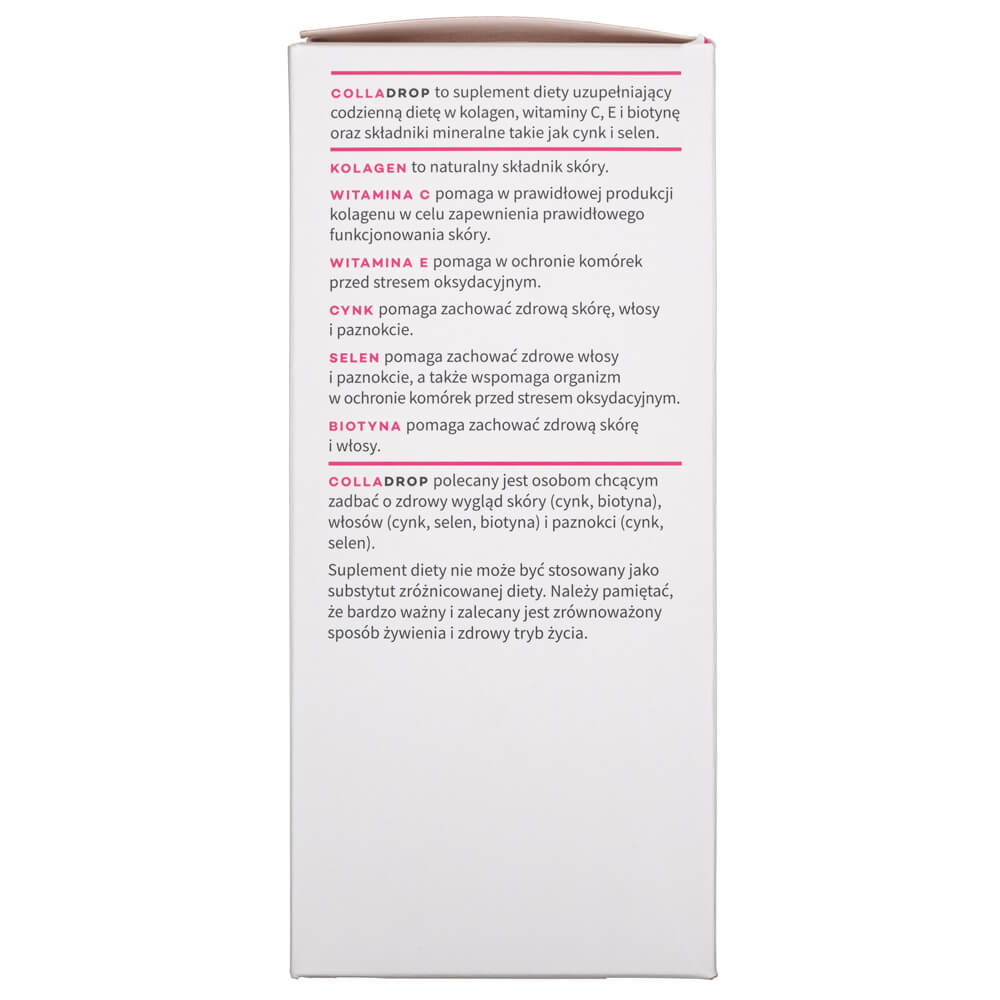 Water, NatiCol® collagen from the skin of sea fish, sweetener: invert sugar, L-ascorbic acid (vitamin C), zinc gluconate, preservative: potassium sorbate, D-alpha-tocopherol (vitamin E), sodium selenite, D-biotin.