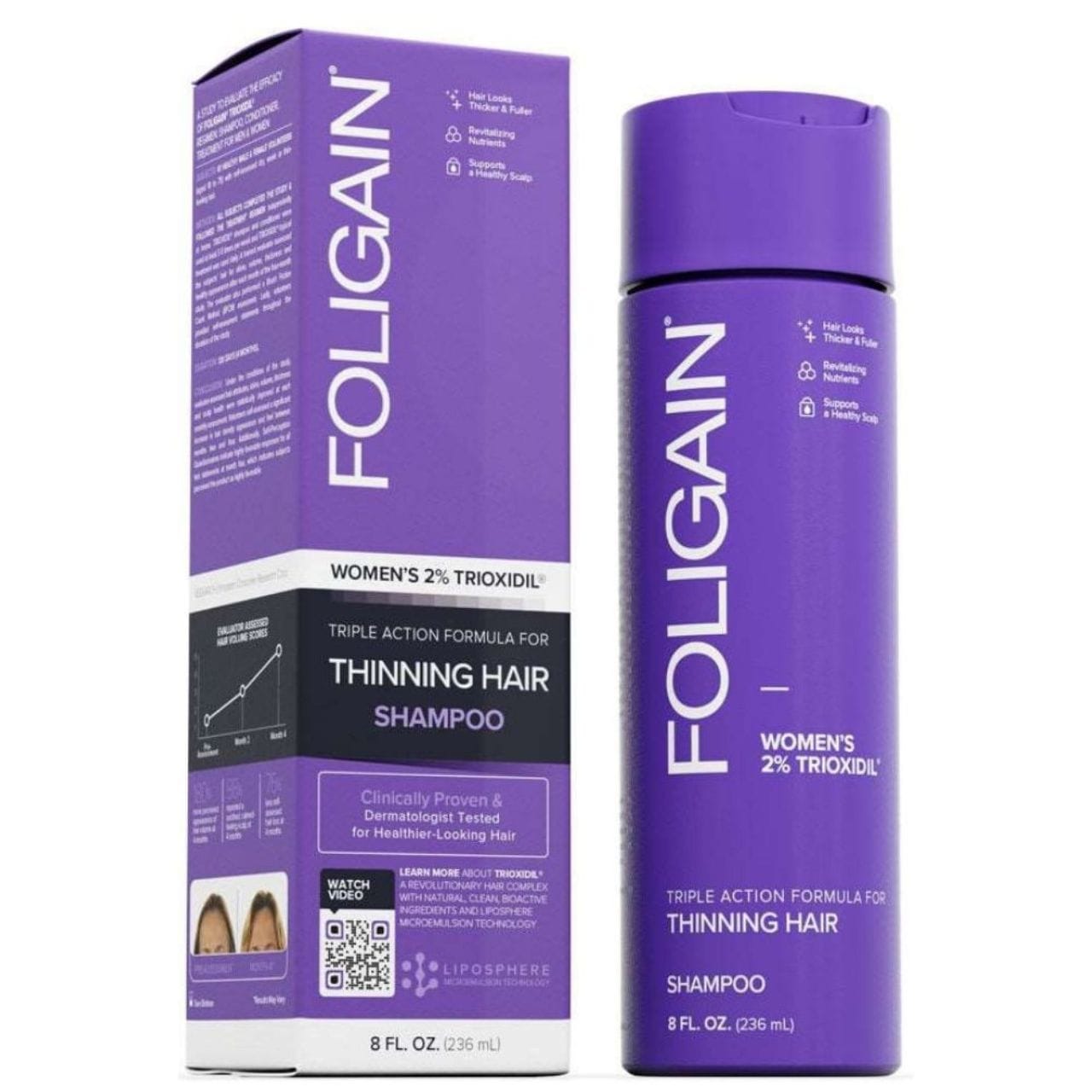 FOLIGAIN Triple Action Shampoo For Thinning Hair For Women With 2% Trioxidil is a revitalising shampoo that effectively promotes hair density and reduces hair loss. The clinically proven formula increases hair volume by up to 180% in 4 months, while nourishing the scalp and strengthening hair follicles.