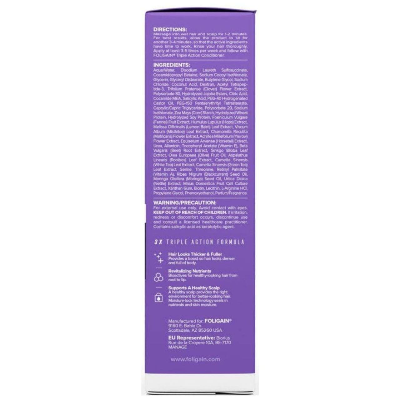Massage the shampoo into damp hair and scalp for 1-2 minutes. Leave on for 3-4 minutes for better effectiveness of the active ingredients, then rinse thoroughly. Use at least 3-5 times a week. For best results, combine with FOLIGAIN conditioner.