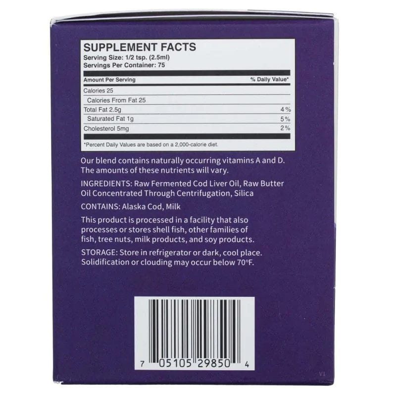 Raw Fermented Cod Liver Oil, Raw Butter Oil Concentrated Through Centrifugation, Silica.