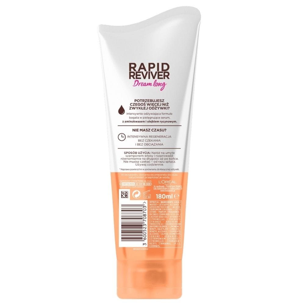 L'Oreal Elseve Rapid Reviver Dream Long is an innovative, concentrated conditioner for long and damaged hair. It provides an express hair transformation thanks to a formula rich in amino acid serum and castor oil. It offers 2 times stronger regeneration than a classic conditioner, is instantly absorbed into the hair and does not weigh it down. Ideal for daily care, it restores vitality and protects hair from breakage.