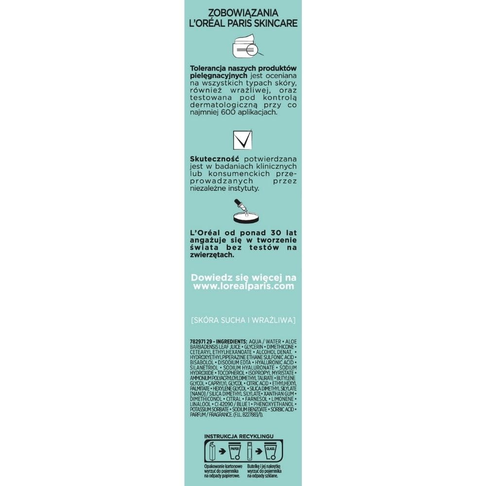 Aqua / Water, Aloe Barbadensis Leaf Juice (sok ze świeżych liści aloesu), Glycerin (gliceryna), Dimethicone, Cetearyl Ethylhexanoate, Alcohol Denat, Hydroxyethylpiperazine Ethane Sulfonic Acid, Bisabolol (bisabolol), Disodium Edta, Hyaluronic Acid (kwas hialuronowy), Silanetriol, Sodium Hyaluronate (sól sodowa kwasu hialuronowego), Sodium Hydroxide, Tocopherol (witamina E), Isopropyl Myristate, Ammonium Polyacryloyldimethyl Taurate, Butylene Glycol, Caprylyl Glycol (glikol kaprylowy), Citric Acid (kwas cytrynowy), Ethylhexyl Palmitate, Hexylene Glycol, Silica Dimethyl Silylate [Nano] / Silica Dimethyl Silylate, Xanthan Gum, Dimethiconol, Citral, Farnesol, Limonene, Linalool, CI 42090 / Blue 1, Phenoxyethanol, Potassium Sorbate, Sodium Benzoate, Sorbic Acid, Parfum / Fragrance (F.I.L B227883/1).
