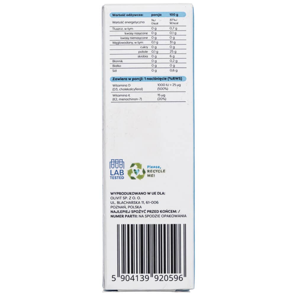 Food supplement with vitamin D3 (cholecalciferol) and vitamin K2 (menaquinone-7). Oral spray with xylitol (with sweeteners) and natural peppermint flavour.