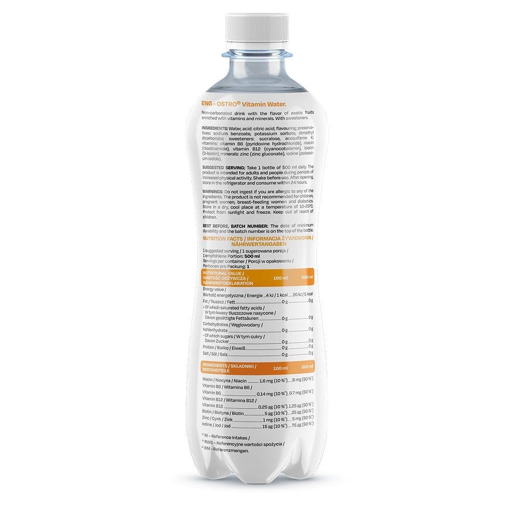 OstroVit OSTRO® Vitamin Water is a low-energy non-carbonated drink that provides the body with valuable vitamins and minerals. It is an exotic fruit-flavoured product with no added sugar, created for athletes and people with an increased demand for valuable micronutrients.